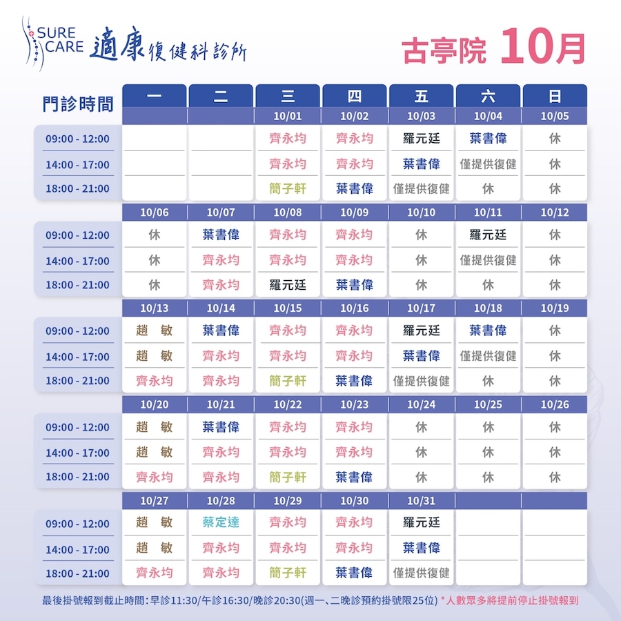 *提醒您請於「該診截止報到」前,攜帶您的健保卡至櫃檯報到 - 復健時間|